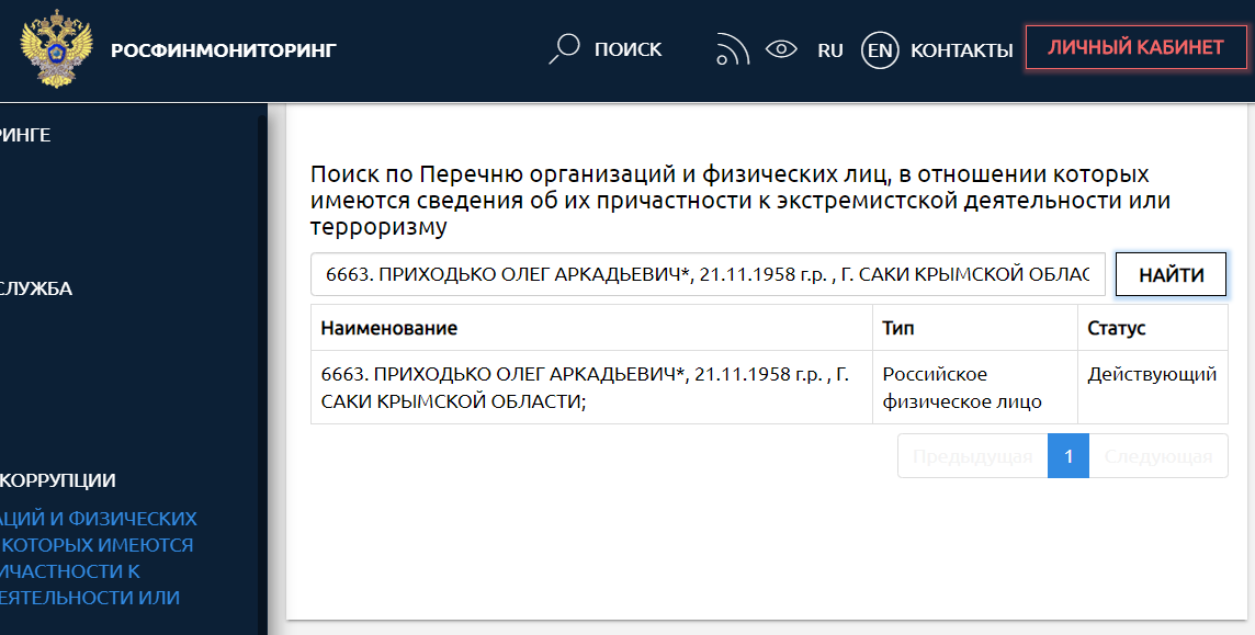 Российская служба по финансовому мониторингу внесла в список лиц, причастных к экстремизму, украинского политзаключенного Олега Приходько, которого в аннексированном Крыму обвиняют в "терроризме". Согласно данным сайта Росфинмониторинга Приходько внесли в список под номером 6663.