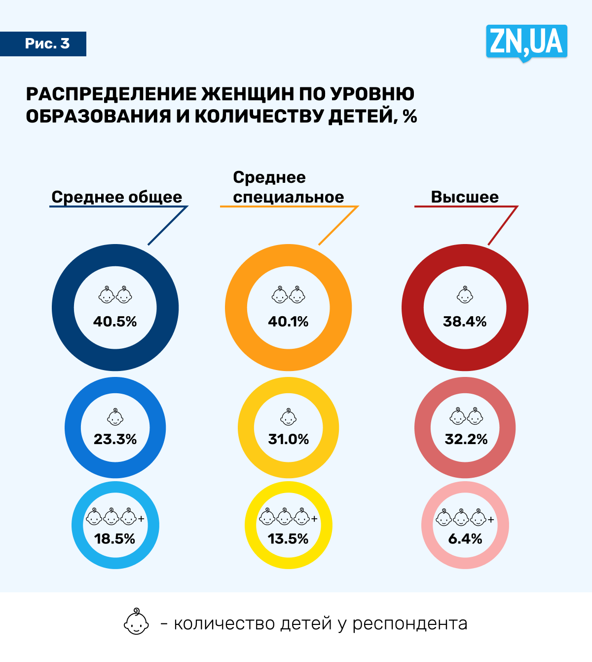 Наблюдается подобная зависимость количества детей от уровня образования отца (многодетными являются 12,0% мужчин с общим средним образованием и 6,6% — с высшим). Так что решение родить ребенка, безусловно, зависит от уровня образования, но практически одинаково и от образования матери, и от образования отца. Из такой связи, конечно, не должно следовать решение о нецелесообразности получения высокой образовательной подготовки украинской молодежью.