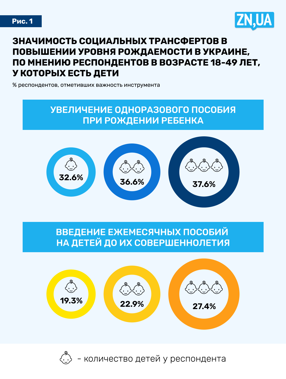 Значительных отличий во взглядах украинцев на основные рычаги повышения рождаемости не наблюдается ни по полу, ни по возрасту, ни по образованию, ни по месту проживания, ни по доходам. Сейчас трудно определить, насколько на эти взгляды влияет война и вызванная ею переоценка ценностей, как будут трансформироваться эти приоритеты после Победы. Но можно уверенно констатировать их наличие, что должно стать основой для дальнейшей разработки политики, направленной на повышение рождаемости.