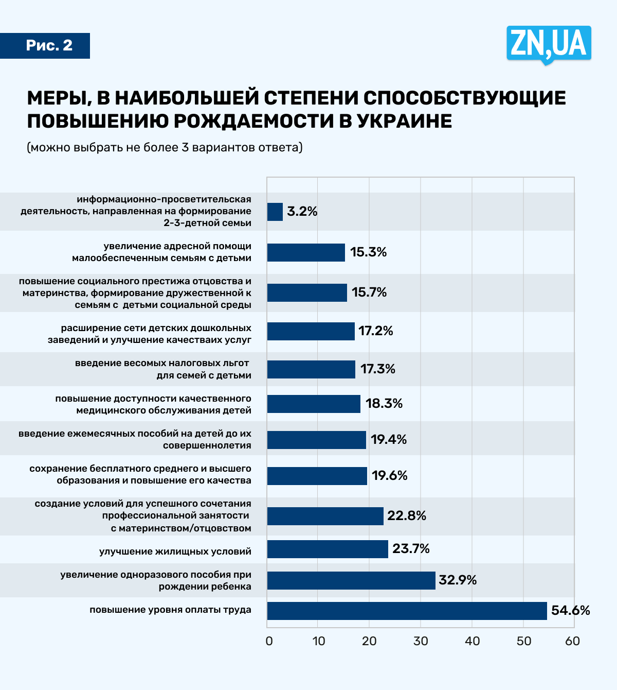 Бросается в глаза, что украинцы хоть и считают повышение уровня жизни критически важным для принятия решения о рождении ребенка, первоочередное значение придают не увеличению социальных трансфертов, а росту уровня оплаты труда. Это свидетельствует о том, что большинство опрошенных переносит акценты с патернализма, с ожиданий государственной помощи на возможность хорошо зарабатывать. Вероятно, существенное повышение зарплаты будет способствовать дальнейшему снижению значения социальной помощи, хотя она есть в политике практически всех развитых стран мира.