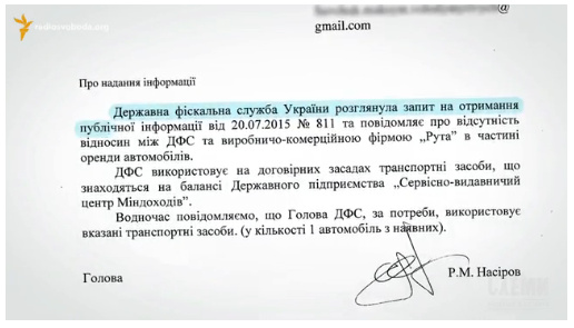 В ответе на информационный запрос с подписью Насирова говорится: "Государственная фискальная служба... сообщает об отсутствии отношений между ГФС и производственно-коммерческой фирмой "Рута" в части аренды автомобилей".