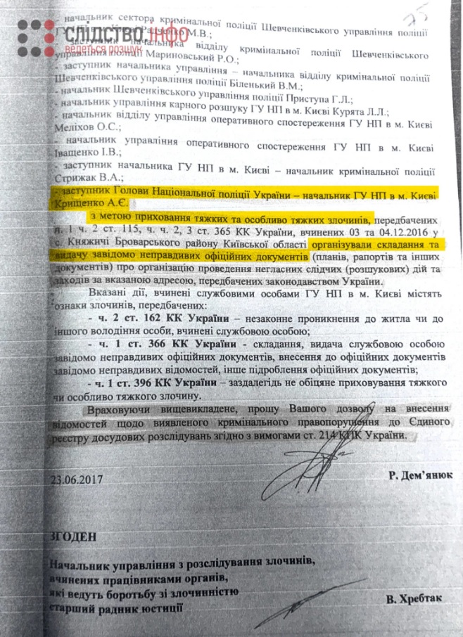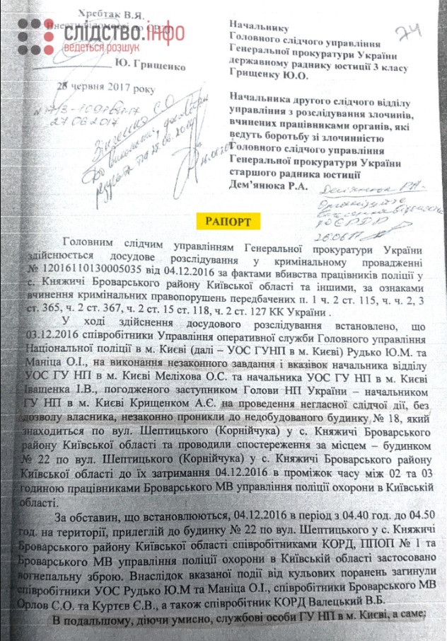 "Прокуроры узнали, что руководители киевской полиции, в частности, начальник Андрей Крищенко, его тогдашний заместитель Виталий Стрижак, бывший начальник уголовного розыска Леонид Курята и другие могли подделать официальные документы после перестрелки, чтобы сфальсифицировать доказательства", - говорится в расследовании.
