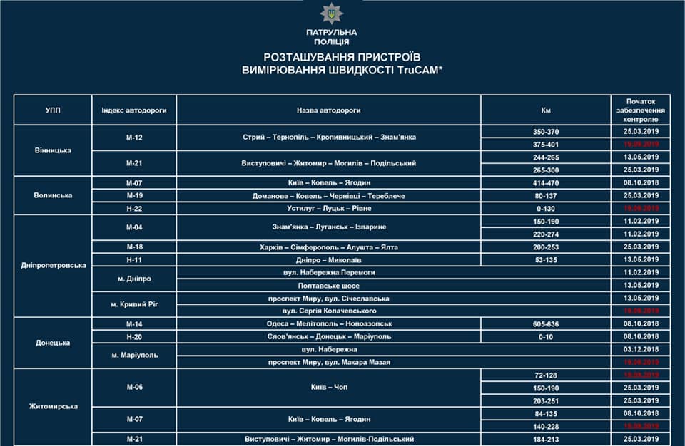 "С 19 сентября на дорогах Украины добавляется 17 новых и будут расширены 8 существующих участков автодорог (с повышенным уровнем аварийности), на которых будет проводиться контроль скоростного режима с помощью лазерных измерителей скорости TruCAM. Всего для измерения скорости на дорогах страны используются 100 таких приборов", - пишет он в Facebook.