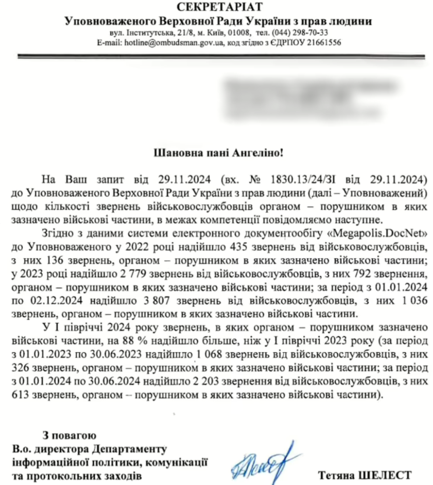 С 2022-го бойцы ВСУ направили Уполномоченному ВРУ по правам человека 1964 жалобы на воинские части, сообщает УП. К омбудсмену в 2022-м поступило 435 обращений (в 136 нарушитель — ВЧ), в 2023-м — 2 779 обращений (в 792 нарушитель — ВЧ), в 2024-м — 3 807 обращений (в 1 036 нарушитель — ВЧ).