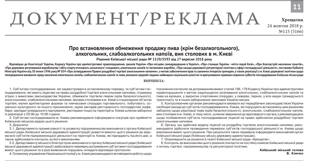 "Субъектам хозяйствования, которые зарегистрированы в установленном порядке, и субъектам хозяйствования, которые имеют лицензию на право розничной торговли алкогольными напитками, полученное в соответствии с требованиями законодательства Украины, ограничить торговлю пивом (кроме безалкогольного), алкогольными, слабоалкогольными винами столовыми в г. Киеве в стационарных объектах торговли и малых архитектурных формах и временных сооружениях торгового, бытового, социально-культурного или другого назначения, кроме заведений ресторанного хозяйства на территории г. Киева путем запрета их реализации с 23:00 до 10:00 часов", - говорится в решении.