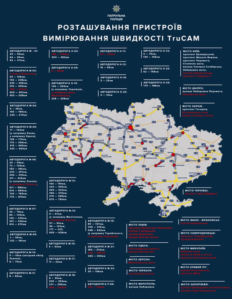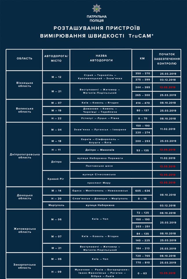 С понедельника, 13 мая, на украинских дорогах появятся еще 25 новых приборов для измерения скорости на дорогах, сообщил первый заместитель начальника Департамента патрульной полиции Украины Алексей Белошицкий. В общей сложности на дорогах страны будут работать 100 радаров TruCAM.