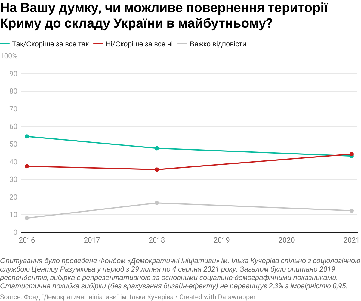 Мнения о возможности возвращения Крыма в состав Украины среди украинцев разделились: 43% считает, что в будущем так и будет, 44% - что это маловероятно или вообще невозможно. Больше всего в возвращение Крыма верят на западе страны - 61%, меньше всего - на востоке (31%). По сравнению с 2016 годом на 11% уменьшилась доля оптимистов, при этом количество скептиков выросло на 7%.
