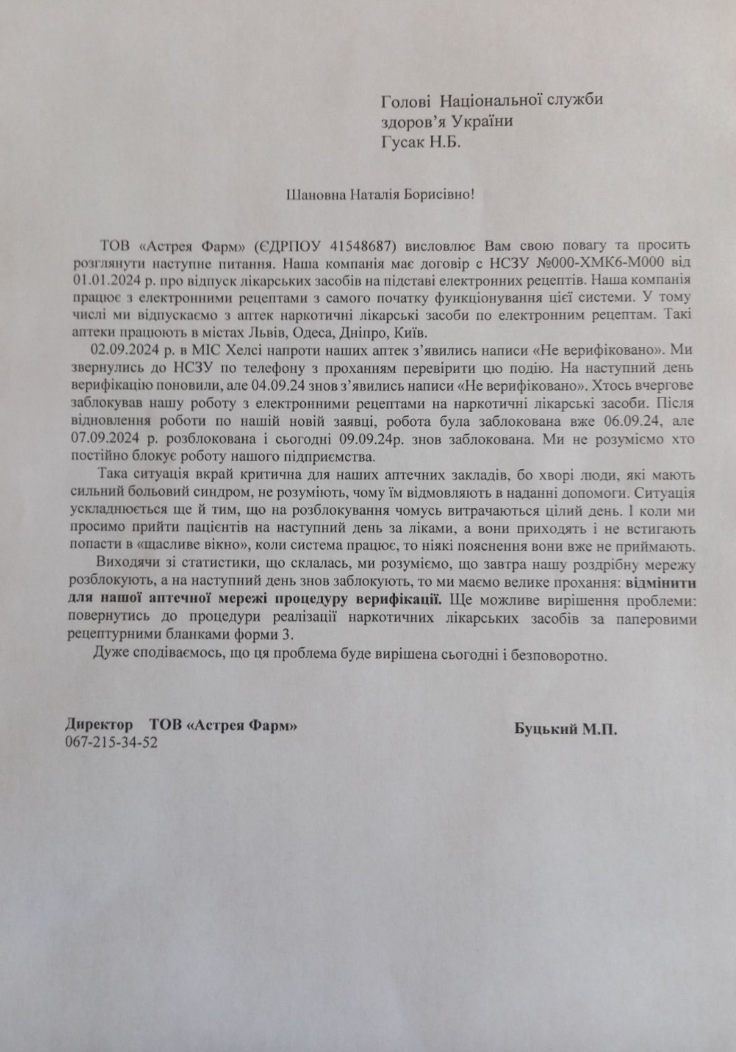 Активистка добавила в свое сообщение обращение директора ООО «Астрея Фарм» к председателю НСЗУ Наталье Гусак, в которой руководитель фармацевтической сети описывает ежедневные сбои в работе.