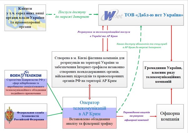 "В Украине среди клиентов ООО "Дабл-Ю Нет Украина", в частности, государственные учреждения, международные организации, крупные банковские учреждения. Сотрудники СБ Украины также установили, что благодаря трафику, полученному от украинского провайдера через магистральный канал, услуги доступа в Интернет получали ФСБ РФ в Крыму, Воентелеком РФ и псевдогосударственные предприятия связи", – утверждают в СБУ.