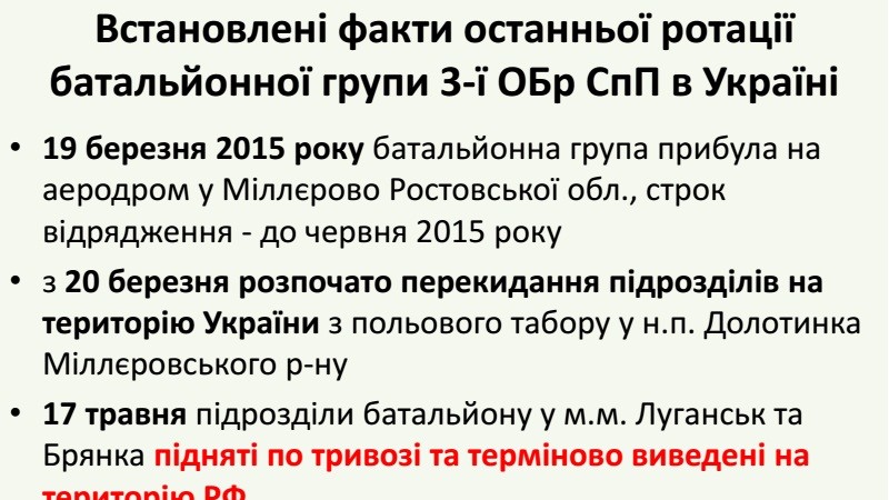 В СБУ обнародовали список из 60 военнослужащих 3-й Отдельной бригады спецназначения ГРУ, доказательства их пребывания в Украине , привели факты последней ротации, документальные доказательства привлечения групп спецназначения ГРУ до обстрелов населенных пунктов Украины с реактивной артиллерии, идентифицировали оружие, которое российские спецназовцы используют во время агрессии против Украины.