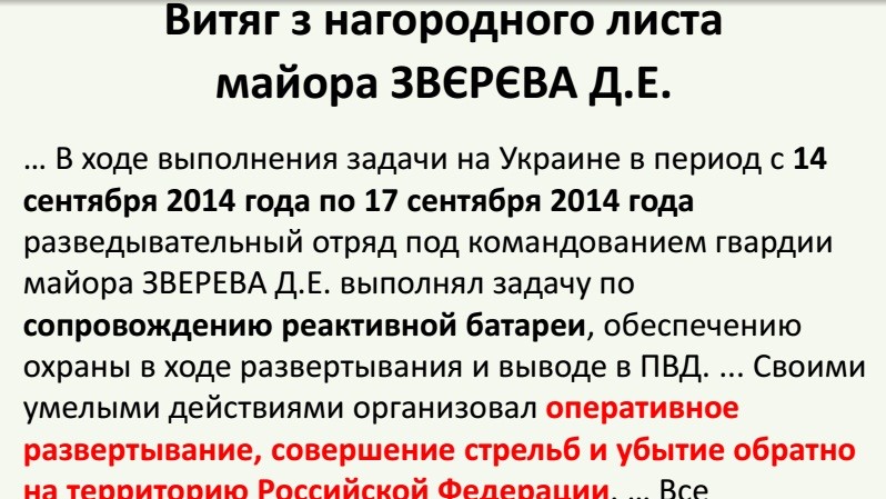 Найда показал выдержки из наградных листов, спецназовцев награжденных "За заслуги перед Отечеством", "За организацию сопровождения реактивных артиллерийских систем" в период с 12 августа по 26 сентября 2014 года и с 14 сентября по 17 сентября 2014 года.