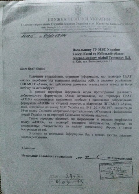 "Главным управлением получена информация, что территория ЧАО "Атек" находится под контролем неизвестных, со знаками различия ППСМОН "Азов", которые осуществляют демонтаж оборудования завода и его порезку на металлолом", - говорится в документе, подписанном начальником Главного Управления СБУ в г. Киеве и Киевской области Михаилом Глуховским.