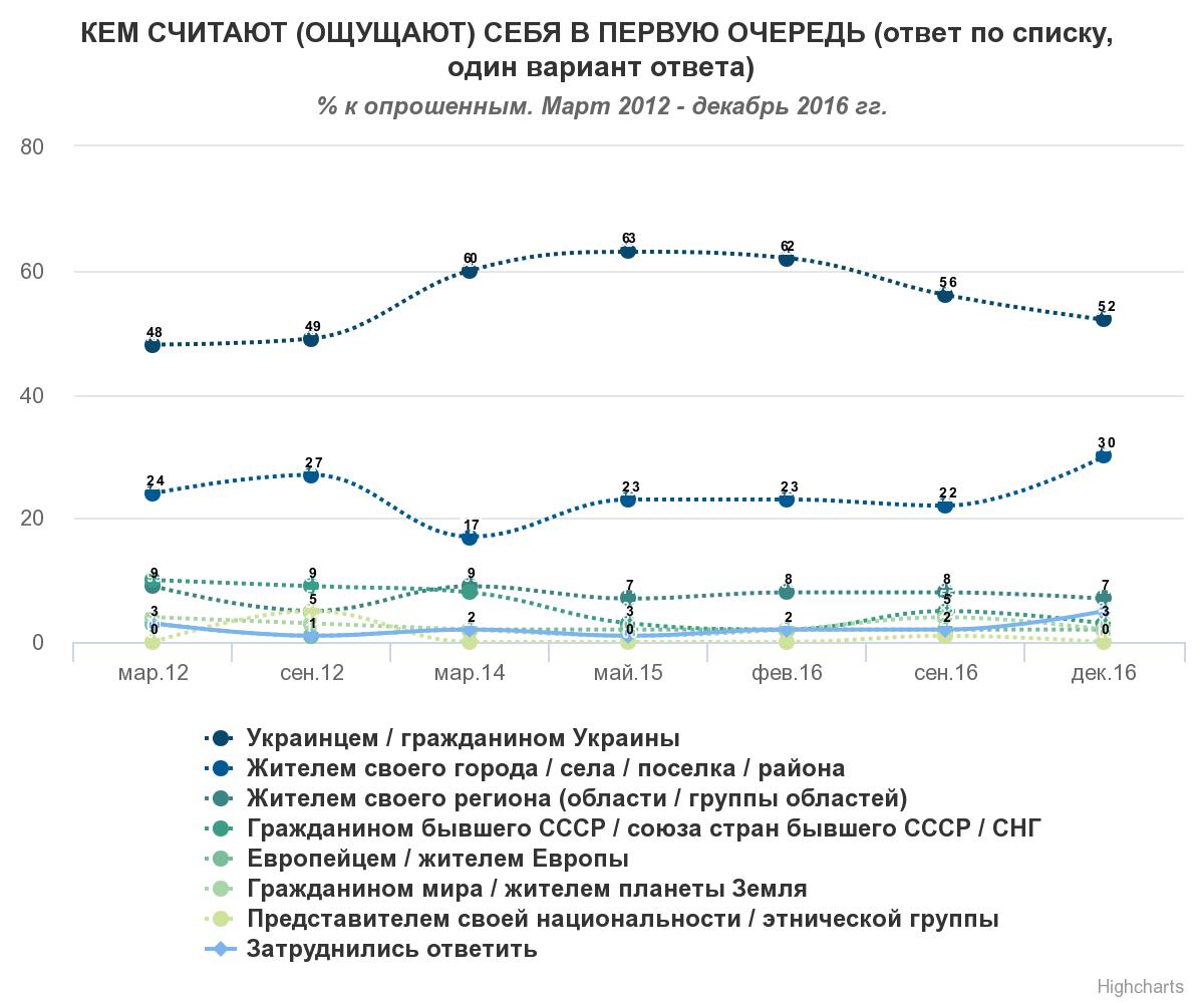 Более высокий уровень национально-государственной самоидентификации отмечается в Центре (59%) и на Западе (54%) Украины, тогда как на Юге и Востоке он несколько ниже (43-44%). Для южных областей больше, чем для других регионов характерна локальная идентичность жителей (44% против 26% в Центре и на Востоке, а также 30% на Западе). Для восточного региона в большей мере, чем для других актуальна региональная идентичность жителей (13% против 4-8% в остальных регионах). Также на Юге и Востоке больше, чем на Западе и в Центре людей с постсоветской идентичностью (4-6% против 1%).