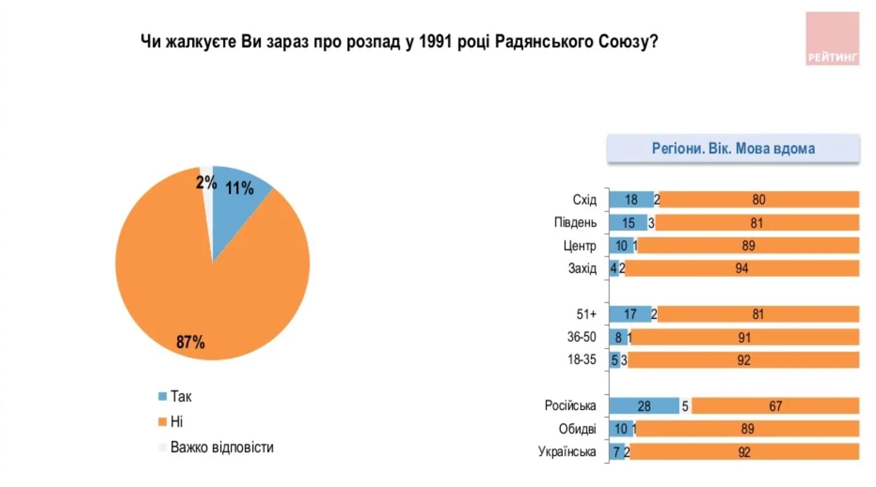 Сегодня в Украине зафиксирован самый низкий показатель ностальгии населения по распаду СССР – сожалеющих за этим украинцев 18%, говорится в результате опроса Социологической группы «Рейтинг». В то же время не сожалеют о советском союзе – 87% граждан.