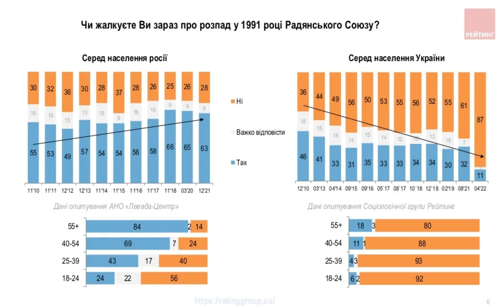 «Полномасштабная агрессия россии против Украины ощутимо повлияла на восприятие идеологических вопросов, особенно связанных с «общей» советской историей. Результаты многолетних наблюдений в Украине и России подтверждали движение общественного мнения в противоположных направлениях по историческому прошлому», – говорится в исследовании.