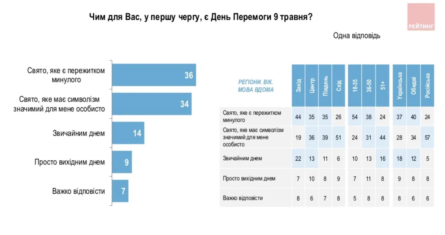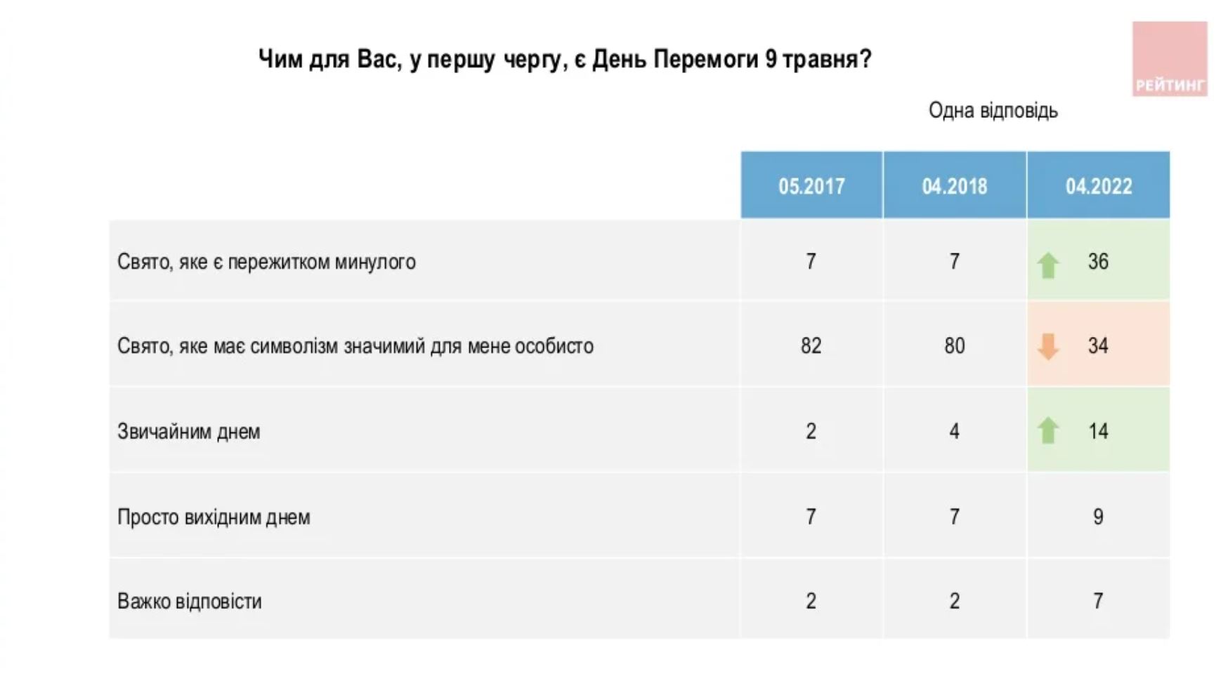 Кроме того, с 2012 года социологи фиксировали постепенную динамику переосмысления даты 9 мая. Но полномасштабное вторжение РФ резко изменило взгляды украинцев. Сегодня 80% граждан отмечают, что 9 мая для них это День памяти. Днем победы дата осталась только для 15% украинцев (в 2018 году таких было 58%).