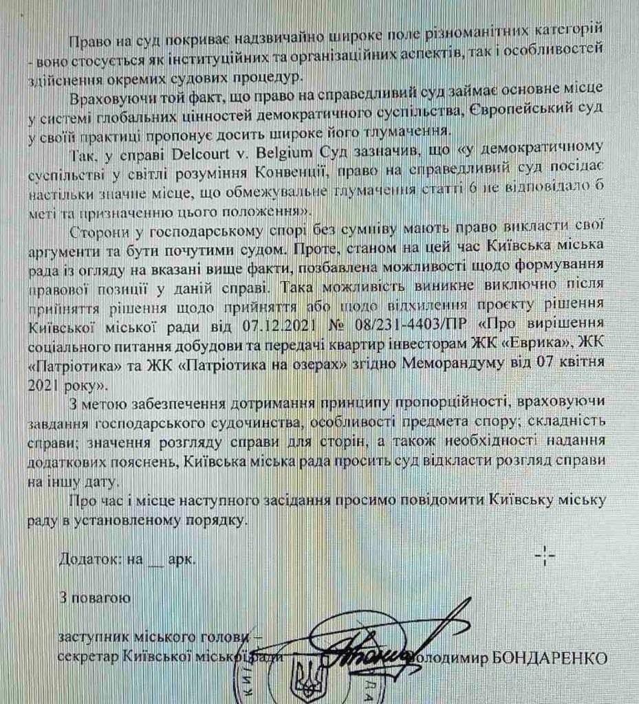 С учетом этого, Бондаренко просит суд отложить рассмотрение и сообщить Киевраде о времени и месте следующего заседания.