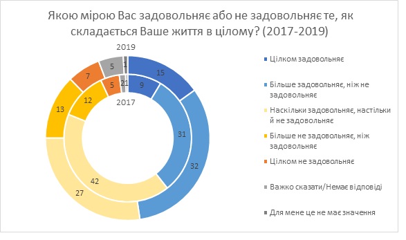 По сравнению с 2017 годом количество счастливых людей в Украине увеличилось: два года назад процент довольных тем, как складывается их жизнь, составлял 39% опрошенных против 48% в 2019 году.