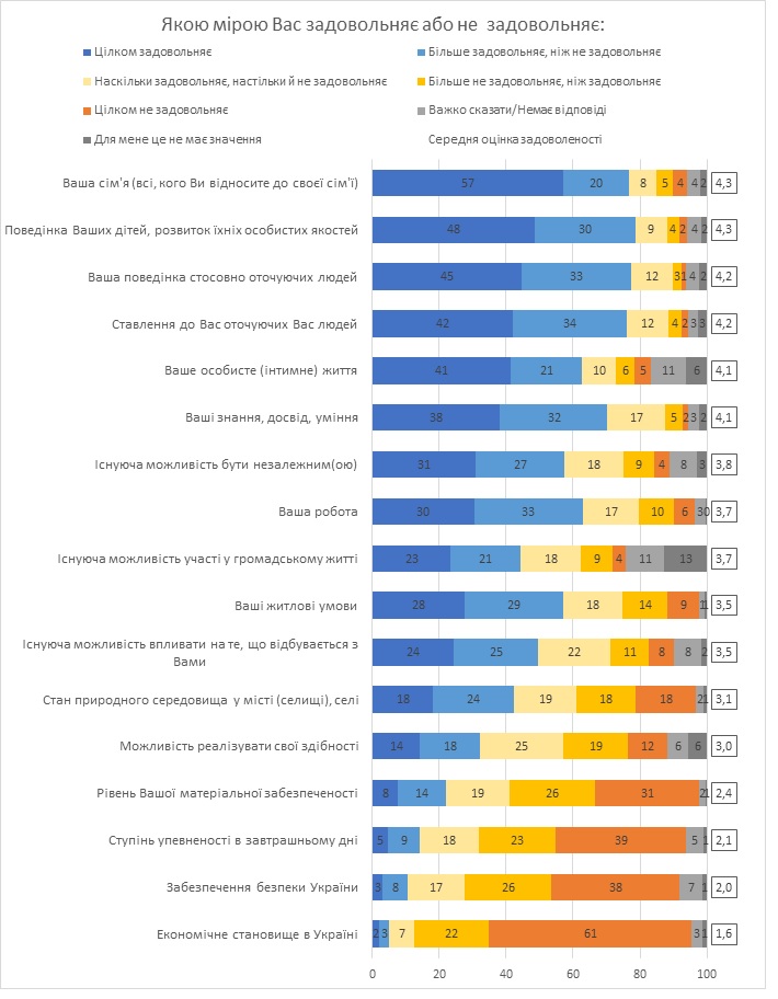 В частности, семьей в той или иной степени довольны 77% опрошенных, недовольны только 9%. К тому же, 78% опрошенных родителей довольны поведением и развитием детей, недовольны – 6%. Своей интимной жизнью, независимо от наличия или отсутствия детей, довольны 63% украинцев, не довольны 10%.