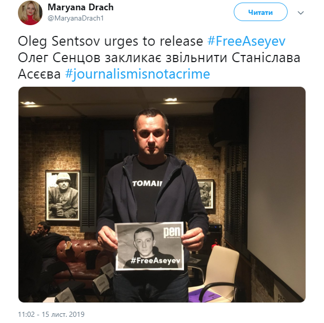 Экс-политзаключенный, украинский писатель и режиссер Олег Сенцов призвал освободить украинского журналиста, автора ZN.UA Станислава Асеева (Васина), которого так называемый "Верховный суд" террористической группировки "ДНР" недавно "приговорил" к пятнадцати годам лишения свободы, сообщила директор украинской службы Радио Свобода Марьяна Драч в своем Twitter.