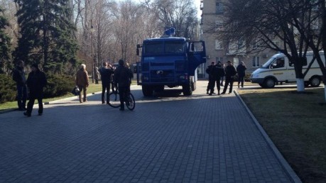"Под ОГА потасовка, у милиции вырывают щиты... В окно ДонОГА сепаратисты бросили гранату. В силовиков летят взрывпакеты. К зданию подогнали водомет", - пишет издание.