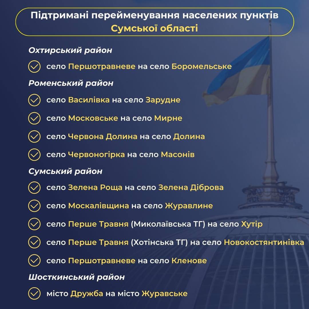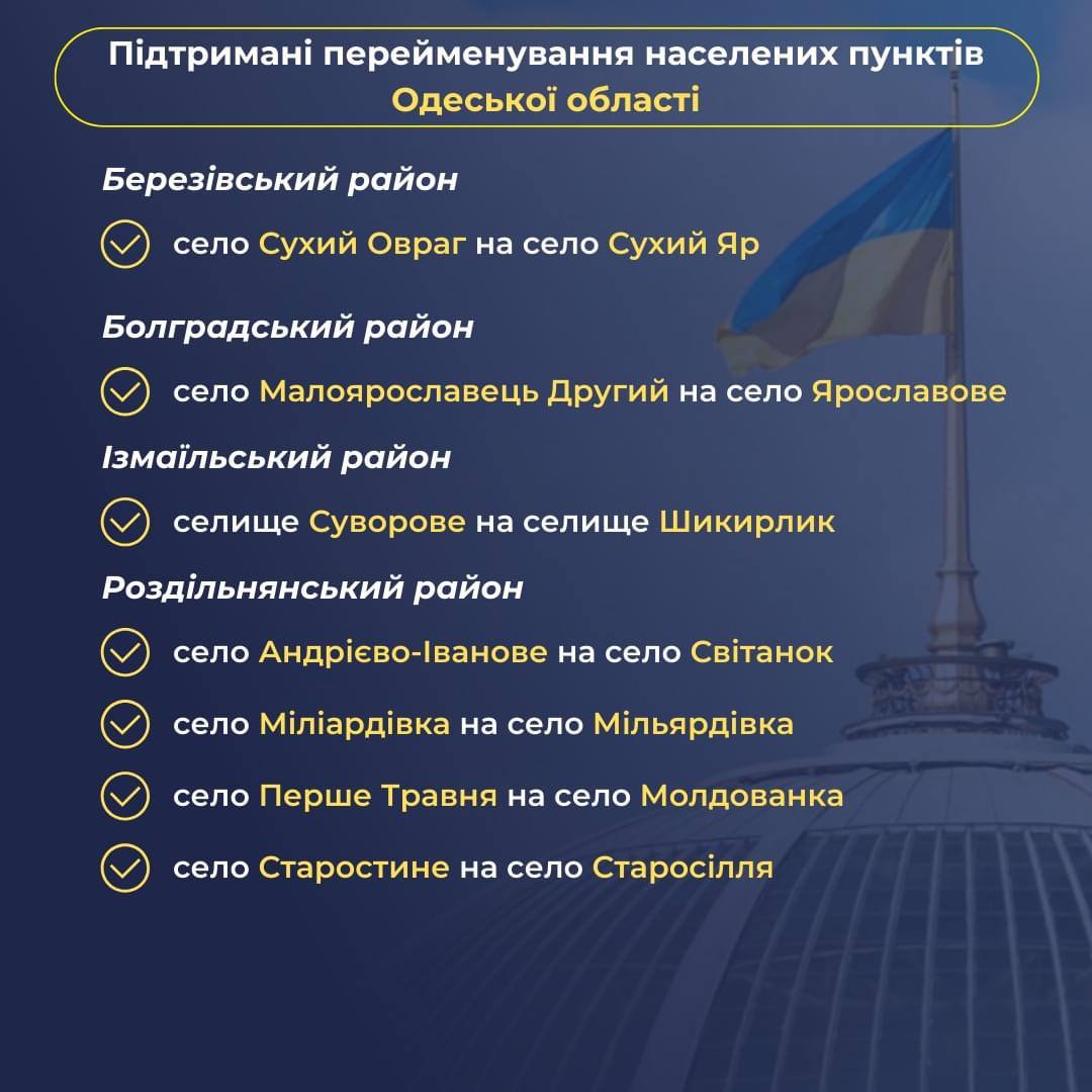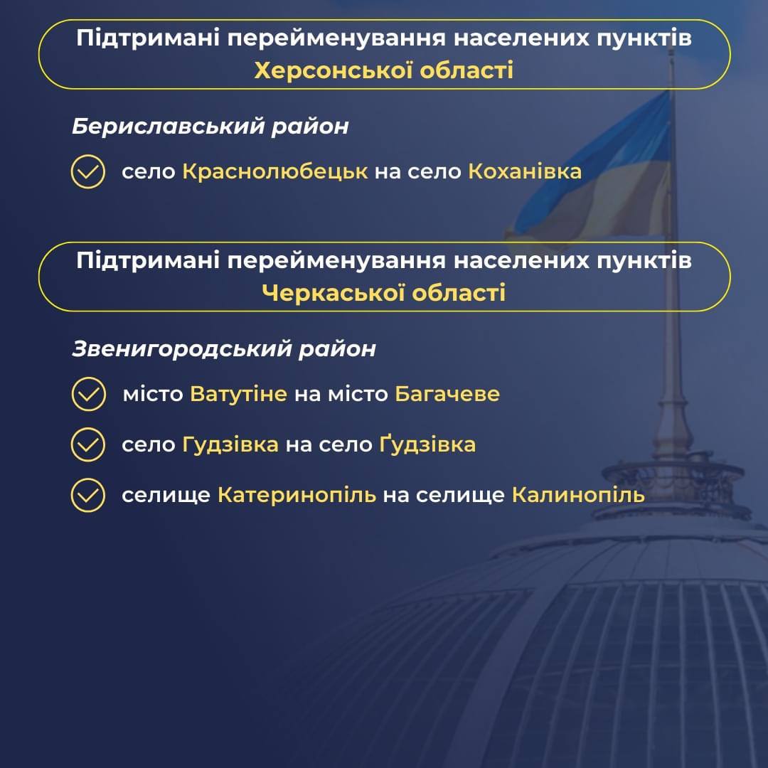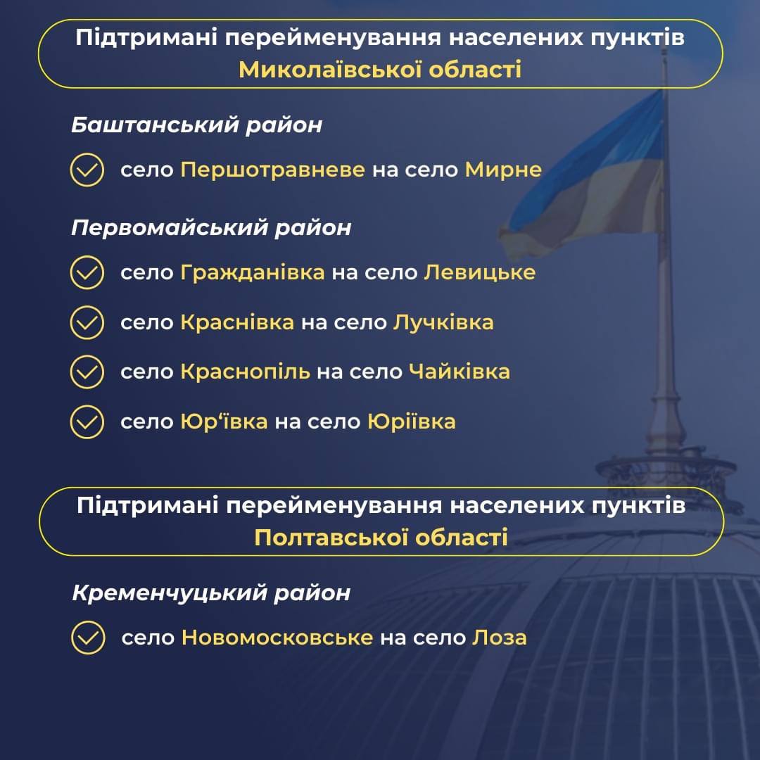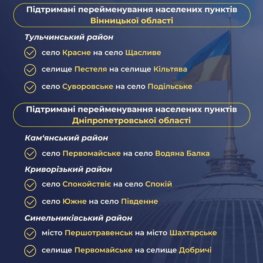 Ранее Украинский институт национальной памяти определил 183 топонима, которые предлагает переименовать в рамках Закона «Об осуждении и запрете пропаганды российской имперской политики в Украине и деколонизации топонимии». В список не включили названия населенных пунктов, которые сейчас находятся на временно оккупированной территории.