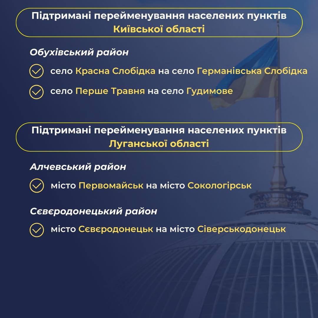 В Днепропетровской области город Первотравенск переименуют в Шахтерское, а в Луганской области город Первомайск в Сокологорск и Северодонецк переименуют в Северодонецк. В Сумской области город Дружба получит название Журавского.