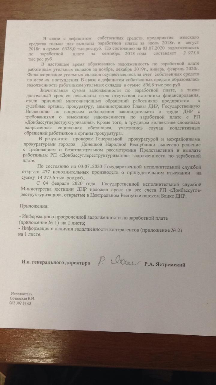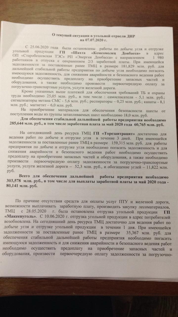 Руководитель «Донбассуглереструктуризации» Роман Ястремский в своем письме в так называемой «министерство угля и энергетики» «ДНР» констатирует, что в трудовых коллективах сложилась «напряженная социальная обстановка».