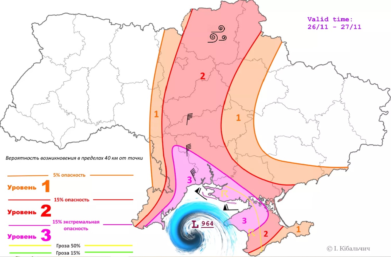 Вечером 26 ноября и ночью 27 ноября циклон пройдет путь от устья Днепра до северных районов Сумской области. В течение всего указанного периода в южных, центральных и северных областях будут фиксироваться опасные, иногда стихийные метеорологические явления.