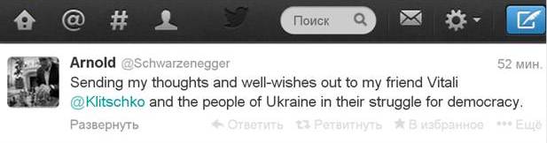 "Посылаю свои добрые пожелания моему другу Виталию Кличко и украинским людям в их борьбе за демократию. Мысленно с вами", - написал Шварценеггер в своем твиттере.