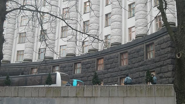 Возле здания Кабинета министров улицу Грушевского перекрывают четыре грузовых автомобиля, один милицейский автобус стоит рядом в тупике. Во дворе Кабмина - шесть милицейских автобусов и два автомобиля.