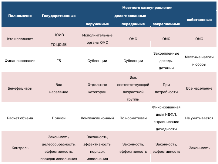 После того как полномочия разграничили между государством и местным самоуправлением и между уровнями самоуправления, возникает вопрос: как разделить их уже внутри самоуправления? Критерием такого распределения на делегированные и собственные является социальный или коммунальный характер таких полномочий.