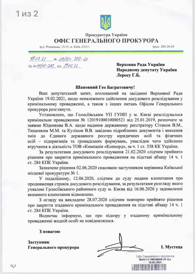 "Голосеевское управление полиции расследовало уголовное производство относительно предоставления государственному регистратору Тищенко М. М. и Куликом В. В. заведомо поддельных документов и внесения изменений в Единый государственный реестр юридических лиц и физических лиц-предпринимателей, вследствие чего осуществлено вмешательство в деятельность ООО “Компания “Конкорд”.