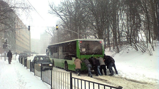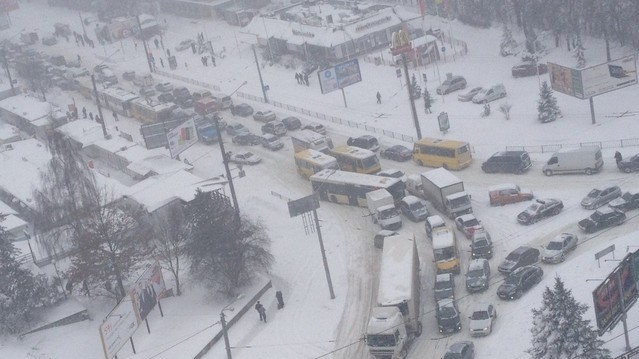 В связи с непогодой движение транспорта во Львове практически остановилось. Утром 15 марта водители оставляют свои машины прямо посреди дороги, и продолжают идти пешком.