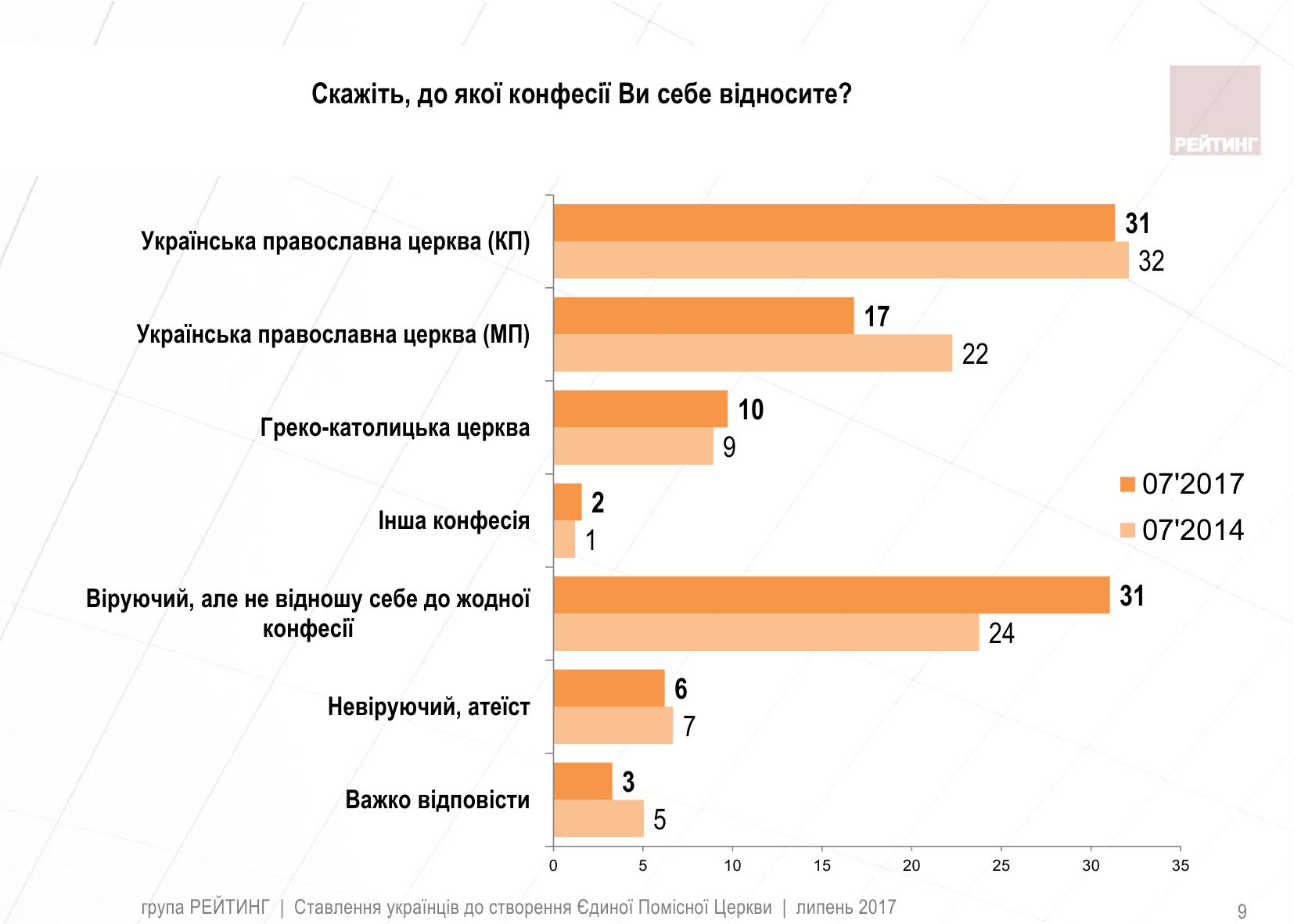 Среди верующих преобладают сторонники Украинской православной церкви (Киевский патриархат) – 31%, верными Украинской православной церкви Московского патриархата остаются 17% респондентов, прихожанами Украинской греко-католической церкви являются 10% украинцев.