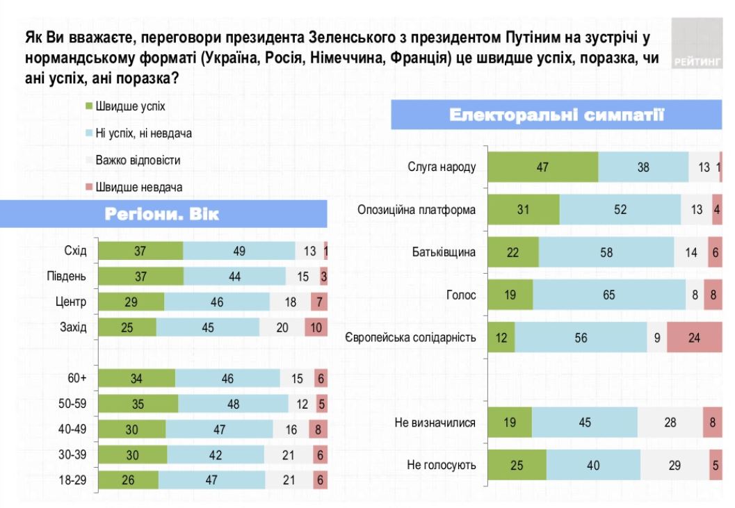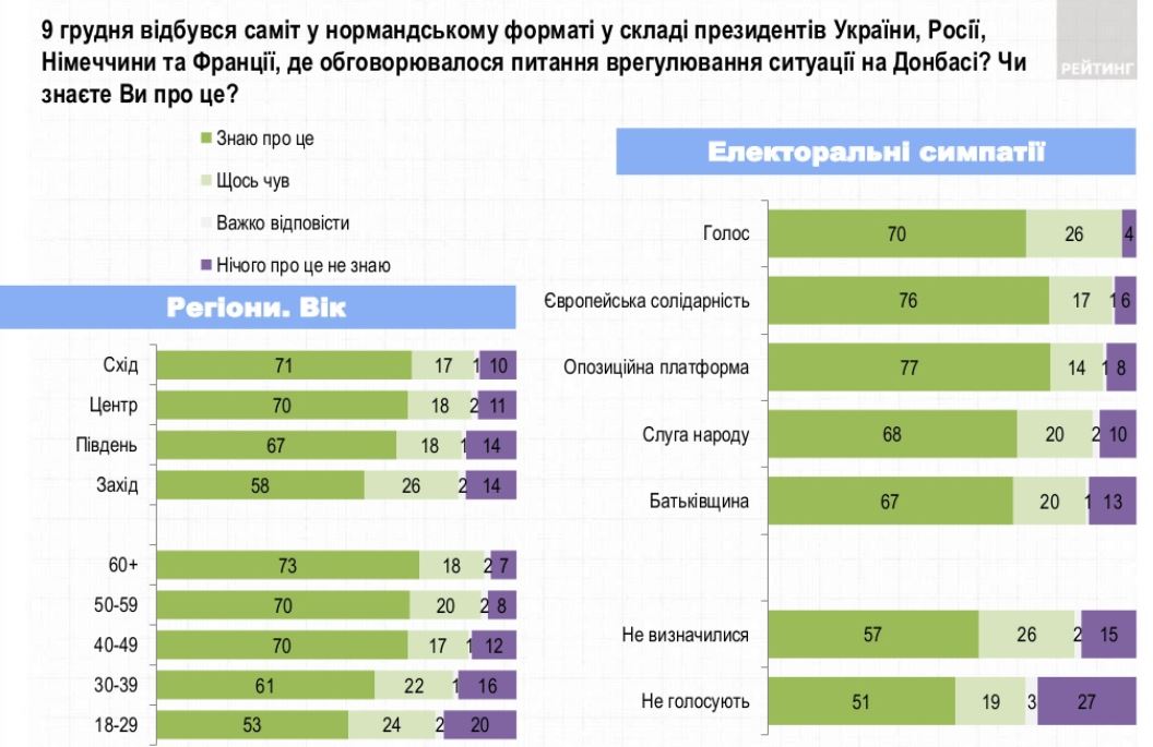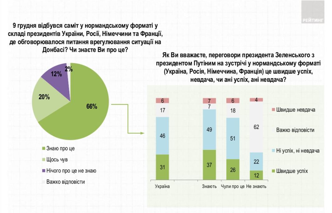 Согласно последним соцопросам от группы "Рейтинг" лишь 66% респондентов были хорошо осведомлены о нормандский саммит, который состоялся 9 декабря.