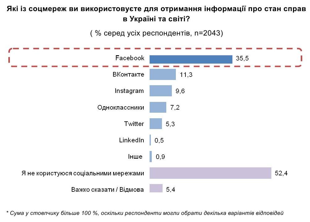 Наиболее популярной сетью сейчас является Facebook, им пользуются 36% украинцев. Другими сетями пользуются не более 11% респондентов