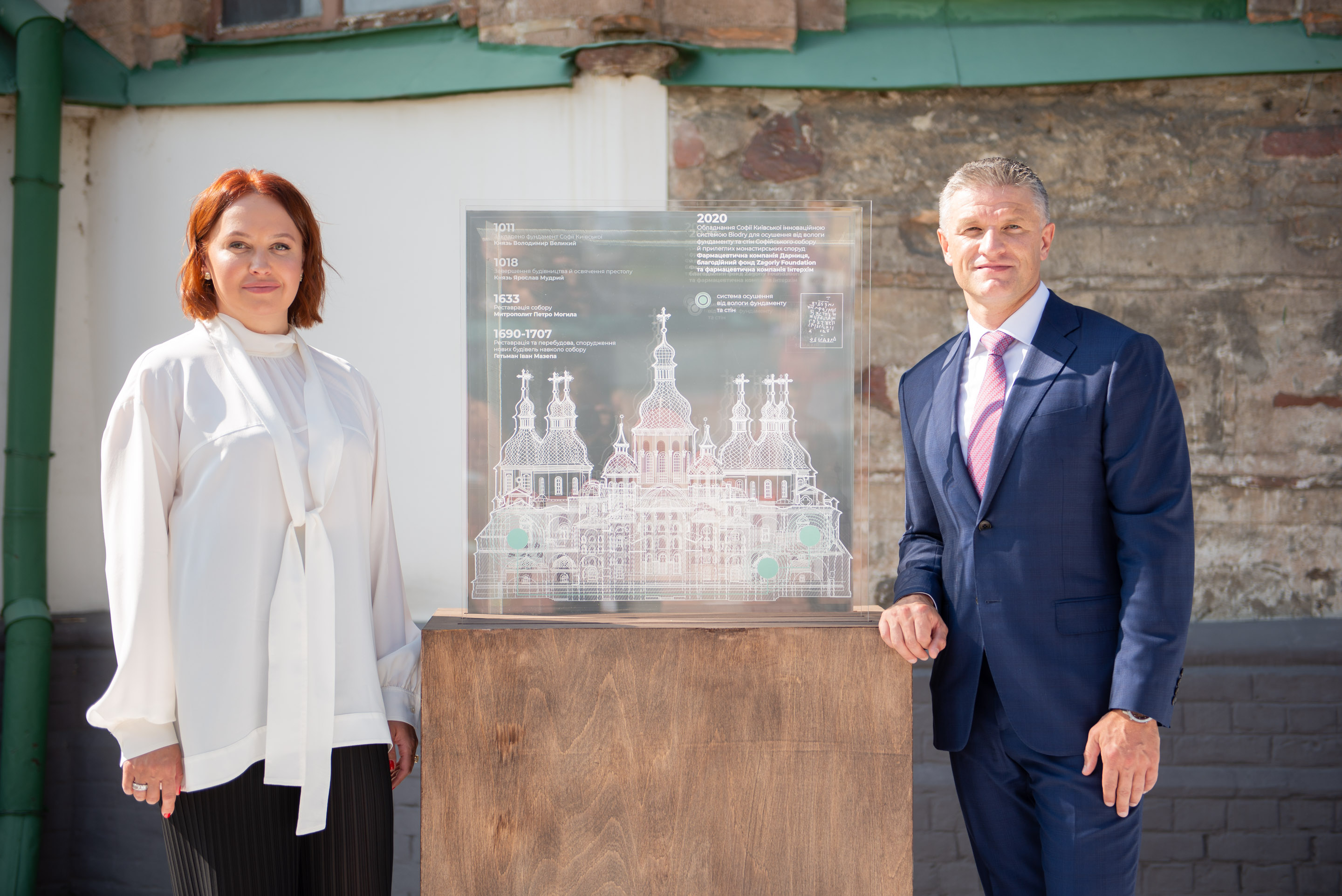 Фармацевтические компании "Дарница" и "Интерхим", совместно с благотворительным фондом Zagoriy Foundation реализовали проект по осушению фундамента и стен Софийского собора и близлежащих сооружений с помощью швейцарского оборудования BioDry. Это позволит привести в норму уровень влаги и избавит от сырости стены и подвальные помещения одного из ключевых памятников Украины - Софии Киевской. Об этом было объявлено на брифинге по случаю старта проекта на территории Софии Киевской 16 сентября.