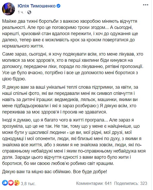 Тимошенко написала, что "кризисное состояние удалось пережить, и хотя до выздоровления еще далеко, теперь уже есть возможность шаг за шагом возвращаться к нормальной жизни".