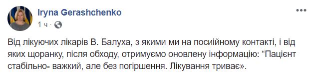 "От лечащих врачей В. Балуха, с которыми мы на постоянном контакте и от которых каждое утро, после обхода, получаем обновленную информацию: "Пациент стабильно тяжелый, но без ухудшения. Лечение продолжается", - написала Геращенко.