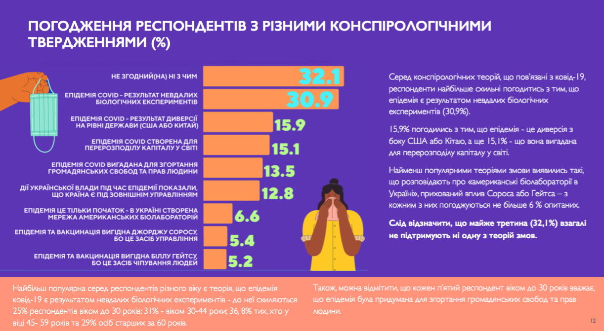 Наименее популярными теориями заговора оказались те, что рассказывают об «американских биолабораториях в Украине», скрытое влияние Сороса или Гейтса - с каждой из них соглашаются не более 6% опрошенных.