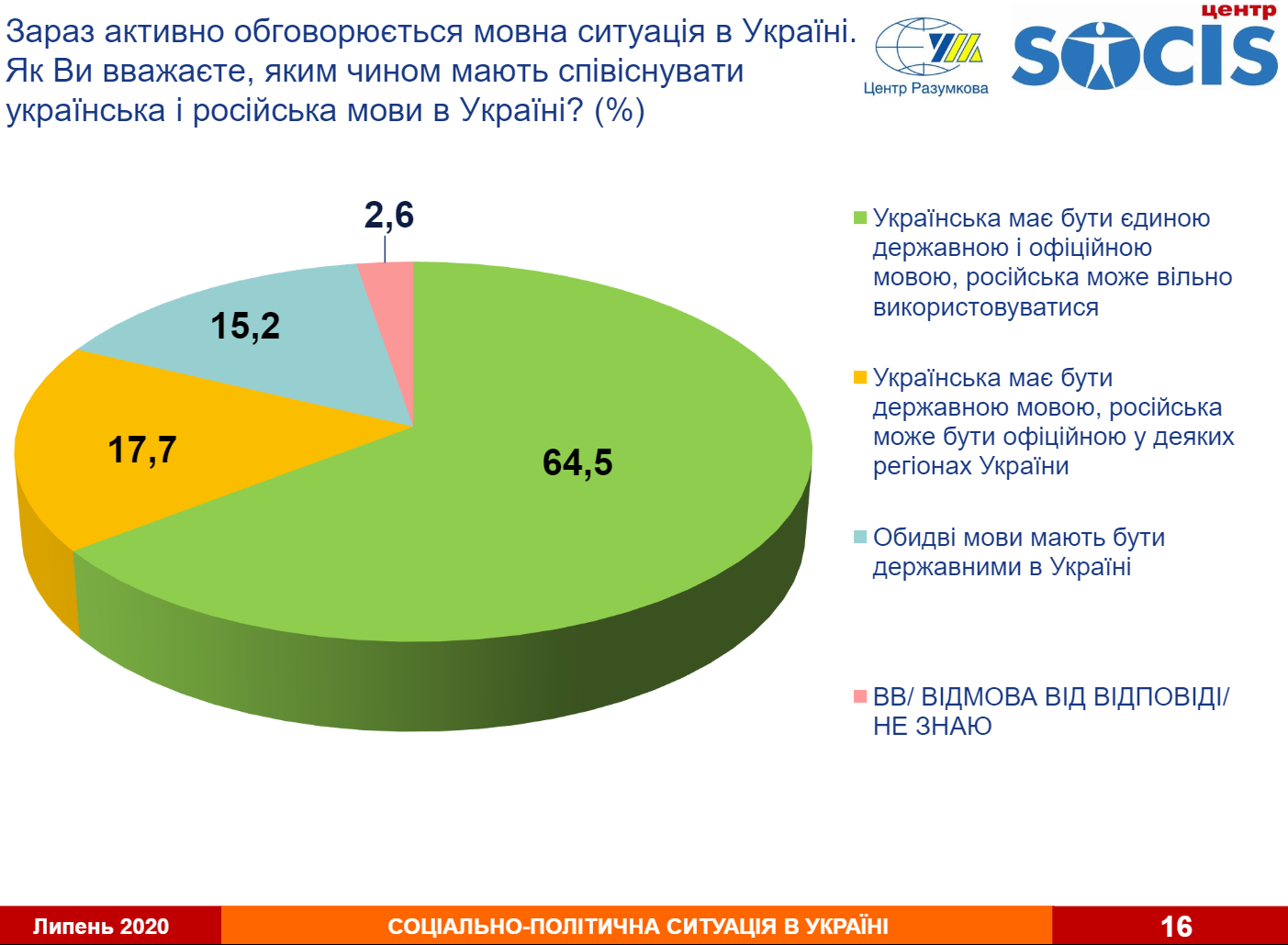 Мнения о том, что украинский язык должен быть единым государственным и официальным в Украине, но русский язык можно свободно использовать, придерживается 64,5% граждан.Об этом говорится в результатах опроса, проведенного Центром "Социс" совместно с Центром Разумкова.
