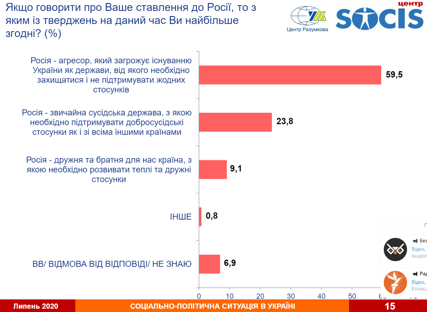 Кроме того, 59,5% респондентов считают, что Россия - это страна-агрессор, которая угрожает существованию Украины как государства, а также страна, от которой нужно защищаться и не поддерживать с ней никаких отношений.