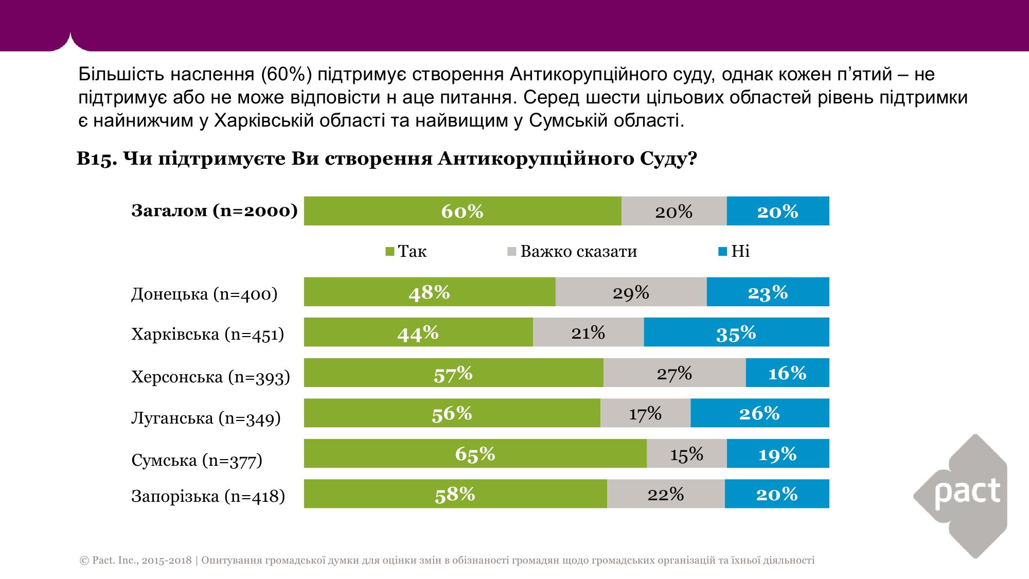 В мае 2018 года большинство населения Украины (60%) поддерживает создание Антикоррупционного суда, однако каждый пятый (20%) не поддерживает, а еще 20% респондентов не смогли ответить на этот вопрос, свидетельствуют данные опроса, проведенного компанией GfK Ukraine.