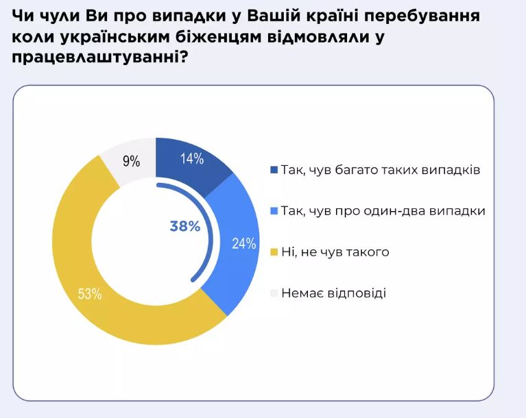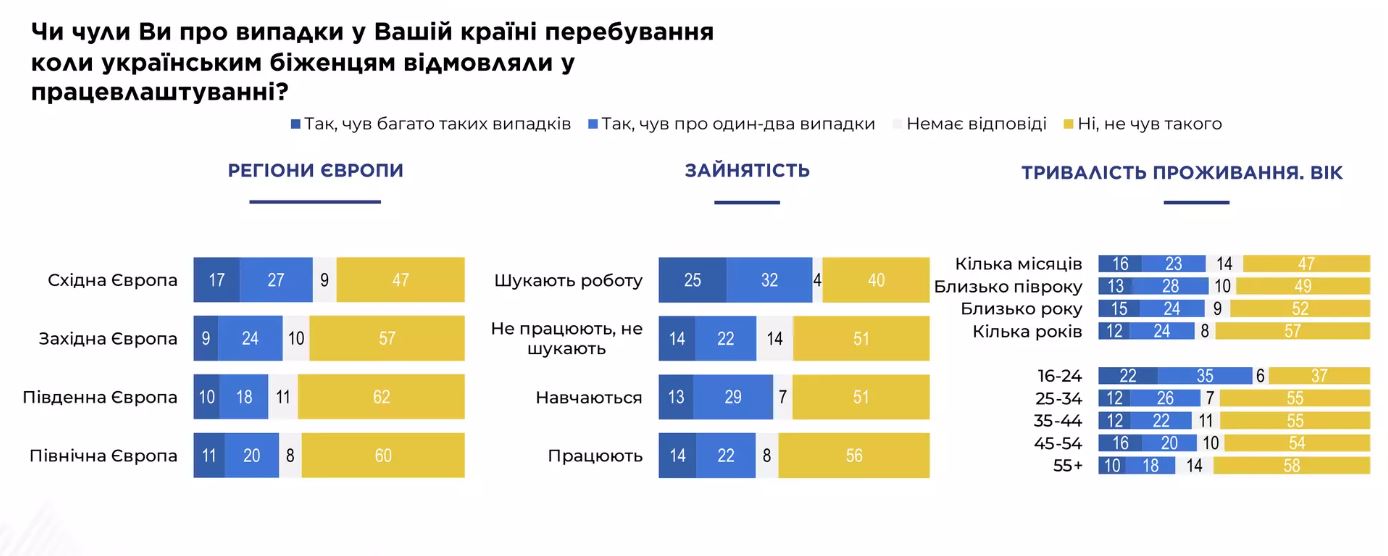 При этом согласно исследованию почти 40% опрошенных украинцев в Европе слышали о случаях отказа украинским беженцам в трудоустройстве. В частности, 14% граждан слышали о многих примерах, еще 24% – об единичных таких случаях. Среди тех, кто активно ищет работу, слышали об отказе в трудоустройстве 57% опрошенных.