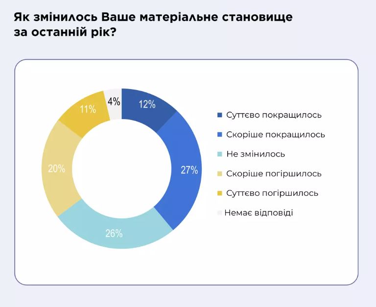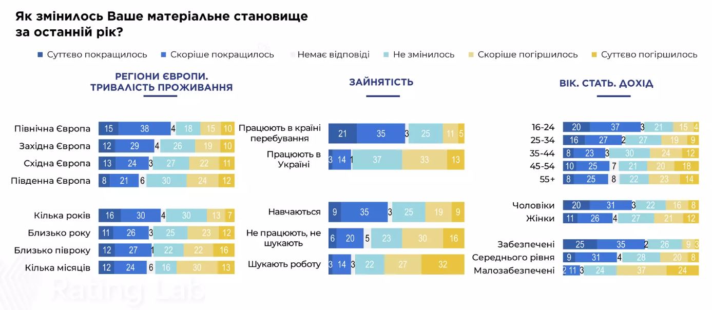 Если говорить об изменении материального положения украинцев за рубежом, то за последний год оно улучшилось почти в 40%. Еще в четверти опрошенных оно не изменилось, у трети ухудшилось. Среди уехавших до вторжения украинцев таких почти половина.