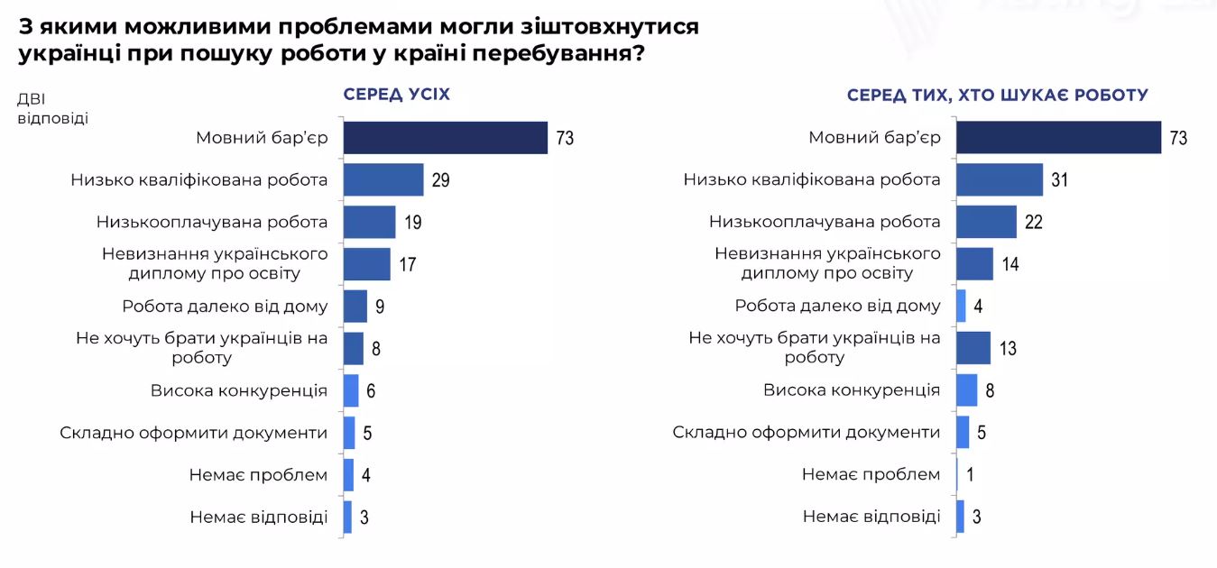 В 73% случаев проблемой для трудоустройства является языковой барьер, в 29% - неквалифицированная работа, в 19% - низкооплачиваемая работа, в 14% - непризнание украинского диплома об образовании.