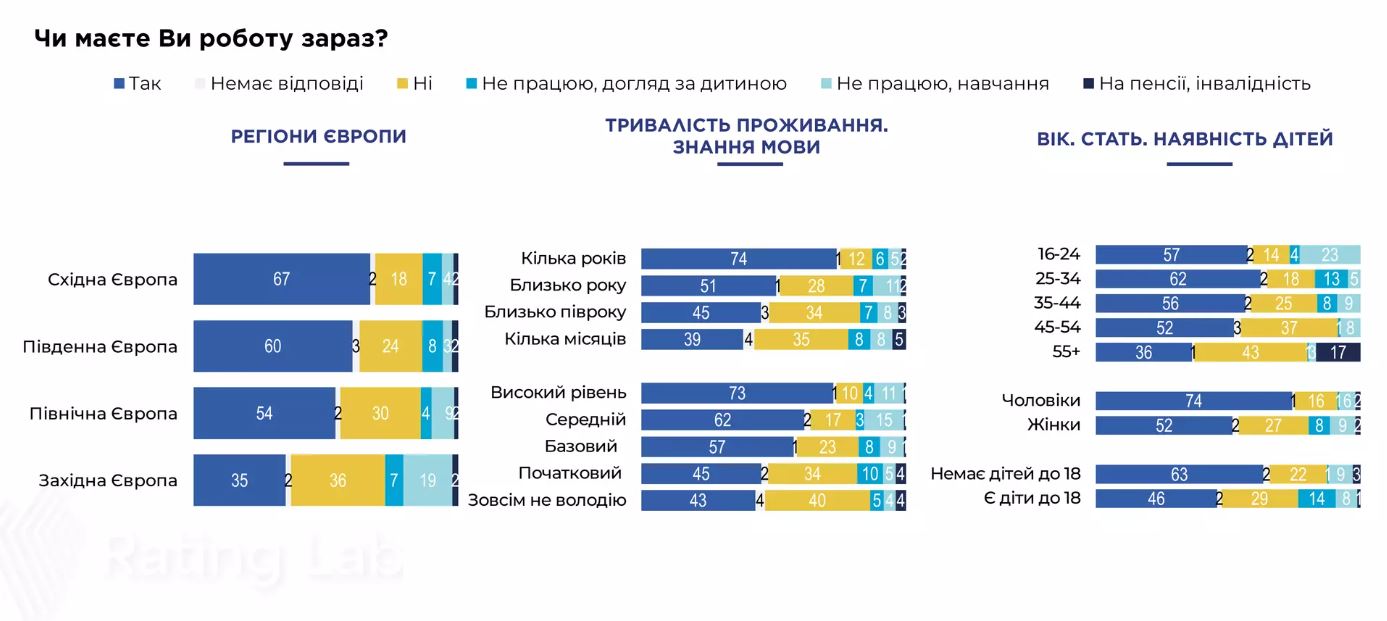 Больше всего трудоустроенных украинцев в Восточной Европе – 67%, меньше всего – в Западной Европе – 35%. Меньше всего трудоустроенных украинцев, приехавших с Юга и Востока страны, а также из Киева. Среди тех, кто хорошо владеет местным языком – большинство работают.