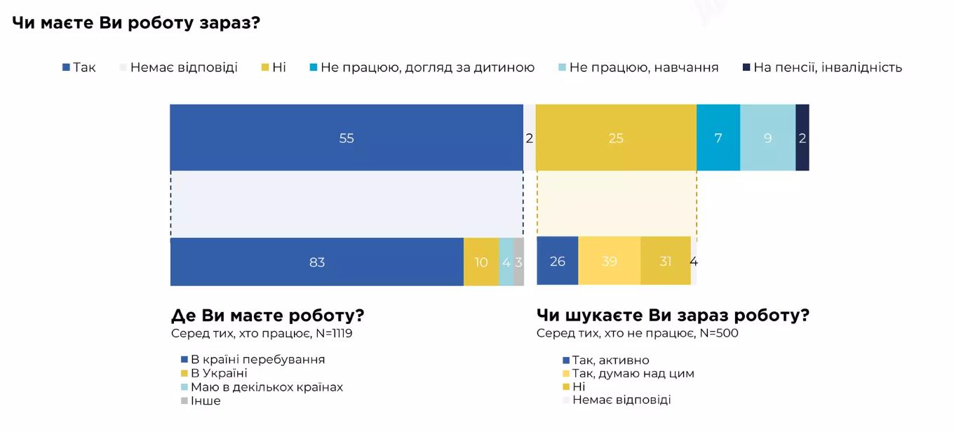 «Респонденты, которые сейчас в активном поиске работы, добавляют сюда нежелание работодателей брать на работу украинцев. О последнем факторе также часто говорят респонденты, продолжающие работать в Украине. Также те, кто работает в Украине, больше других видят проблемой неквалифицированную работу, и, возможно, поэтому не хотят менять украинскую работу на нее», – говорится в результатах опроса.