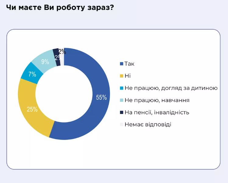 Среди выехавших в Европу украинцев, которые спасались от войны, трудоустроены лишь 49%, говорится в результатах опроса Социологической группы «Рейтинг». В то же время среди выехавших до полномасштабного вторжения РФ 74% украинцев имеют работу.